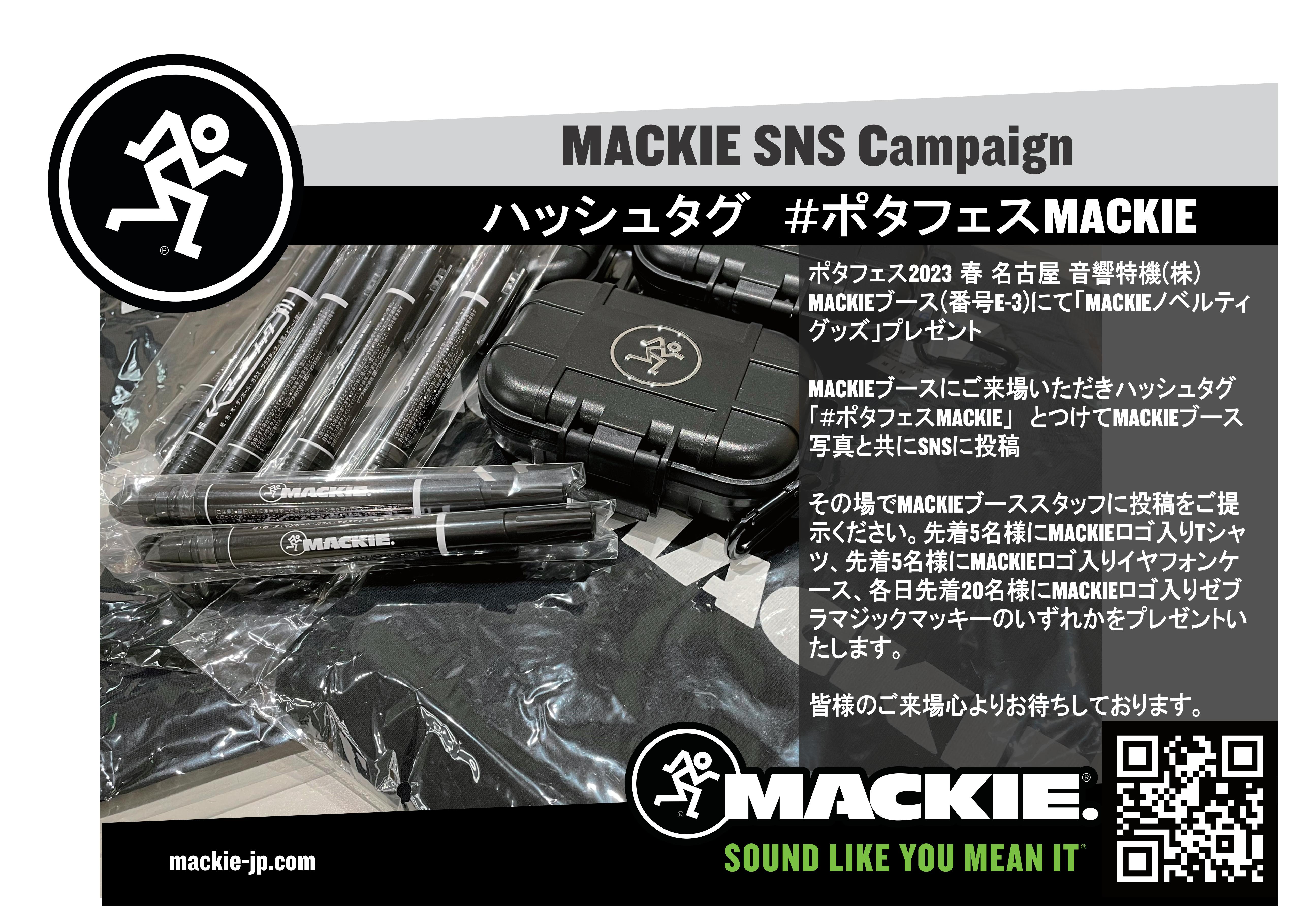 「ポタフェス2023 春 名古屋」 MACKIEブース(ブース番号:E-3)にご来場いただきハッシュタグ『#ポタフェスMACKIE』 とつけてブース写真と共にSNSに投稿いただき、その場でスタッフに投稿をご提示ください。先着5名様にMACKIEロゴ入りTシャツ、先着5名様にMACKIEロゴ入りイヤフォンケース、先着20名様にMACKIEロゴ入りゼブラマッキーのいずれかをプレゼントいたします。豪華ノベルティを是非、MACKIEブースでゲットしてくださいね!遅い時間にしか来ることのできない方もあきらめないでください!! Mackieは期待を裏切りませんよ。
