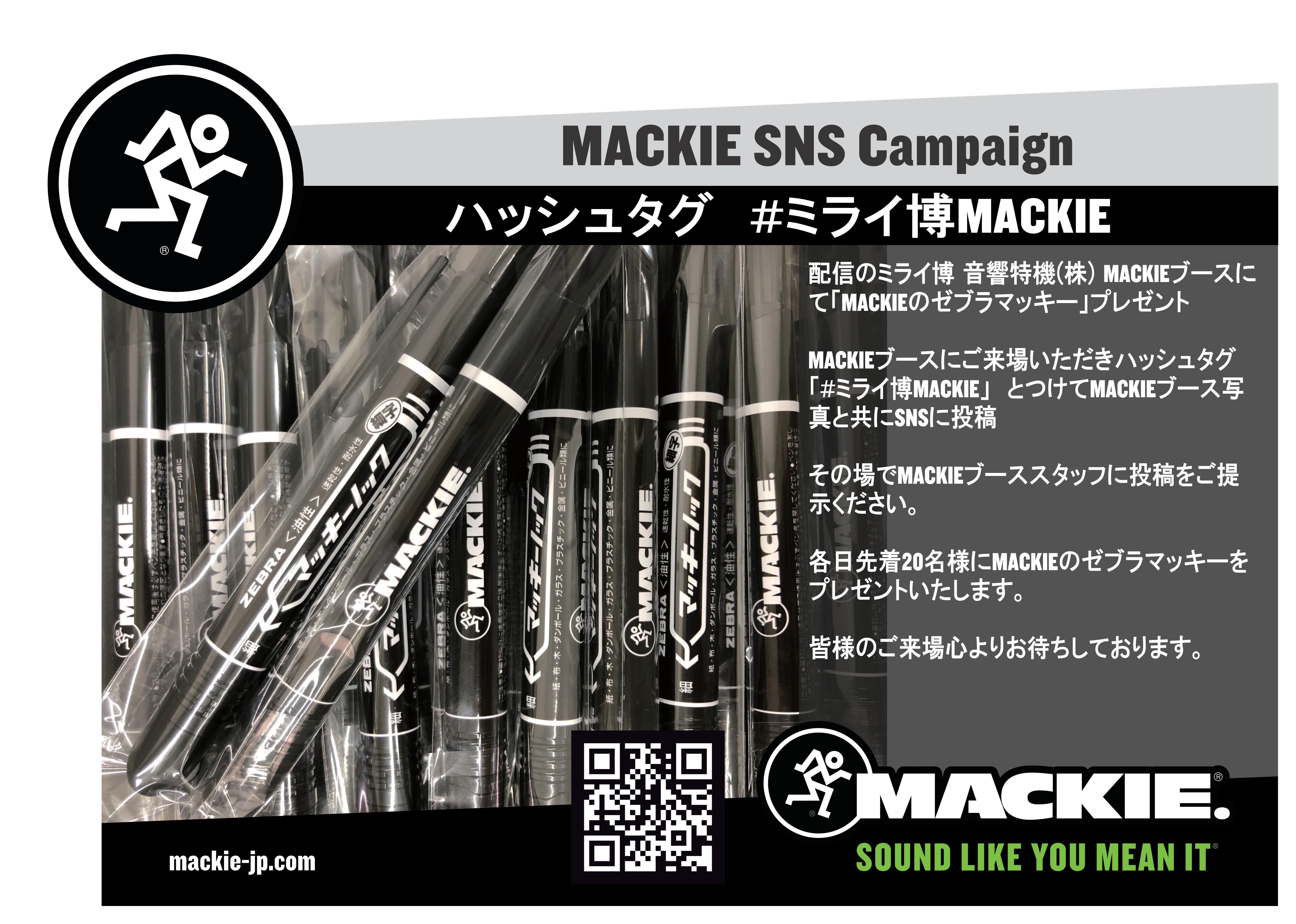 「配信のミライ博」Mackie展示ブースご来場いただきハッシュタグ『#ミライ博MACKIE』 とつけてブース写真と共にSNSに投稿いただき、その場でスタッフに投稿をご提示ください。各日先着20名様にMACKIEロゴ入りゼブラマッキーをプレゼントいたします。レアアイテムとして人気のMACKIEマッキーを是非、Mackie展示ブースでゲットしてくださいね!遅い時間にしか来ることのできない方もあきらめないでください!! Mackieは期待を裏切りませんよ。
